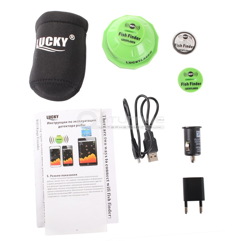 беспроводной WI-FI датчик, чехол неопреновый, сменные крышки для ночной и дневной рыбалки, USB кабель, зарядное устройство от 220 В и 12 В автомобильное, инструкция на русском языке |