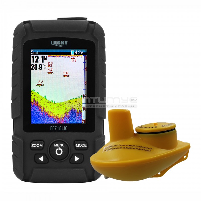 Беспроводной эхолот Lucky FFW718LiC - один из лучших беспроводных эхолотов от китайских производителей. Этот небольшой эхолот можно применять в разных условиях поиска рыбы: ловля с берега - привязали к спиннингу и забрасываете туда куда Вам нужно, ловля с лодки, ловля с пирса, ловля с моста. Беспроводной датчик работает на дистанции до 180 м - очень мало эхолотов, которые могут похвастаться такой дальностью. Глубина эхолокации достигает 45 м - это дает возможность рыбачить даже на больших водохранилищах и некоторых участках моря. А срок службы заменяемой батарейки беспроводного датчика до 550 часов. Не мало важным преимуществом эхолота Лаки FFW718LiC является возможность использовать его для зимней рыбалки.