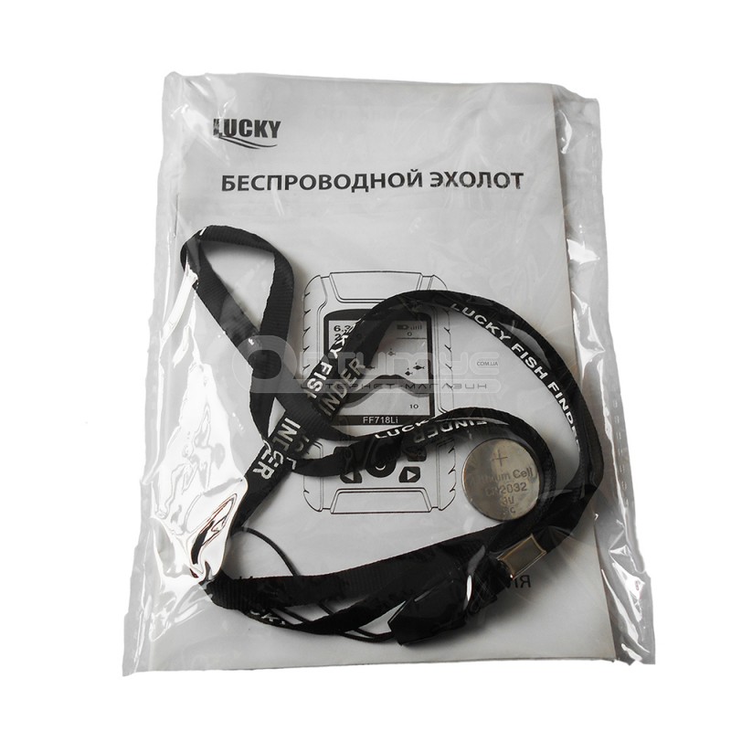 монитор эхолота, крепежный элемент, датчик с кабелем питания, беспроводно датчик, USB кабель, зарядное устройство от 220 В и 12 В автомобильное, ремешок на шею, литиевая батарейка CR 2032 для беспроводного датчика инструкция на английском языке |