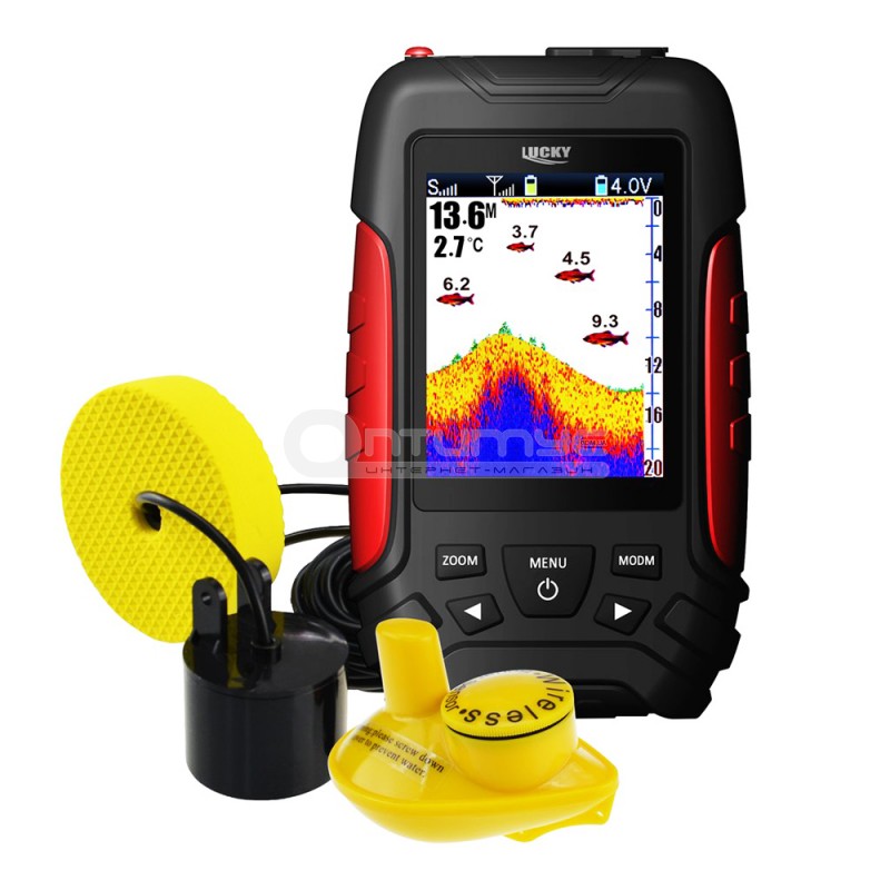 Эхолот Lucky FL168LIC-WT - ещё один эхолот от известной китайской компании, который имеет 2 датчика в комплекте. Один из них проводной, второй беспроводной. Проводной датчик работает на частоте 200 кГц с углом раскрытия луча 45°, а беспроводной излучает сигнал на частоте 125 кГц с углом раскрытия до 90°. Дальность действия беспроводного датчика до 100 метров. Глубина сканирования проводного датчика до 100 м, беспроводного до 45 метров. Проводной датчик достаточно чувствительный и способен фиксировать разные объекты на дне, в том числе и коряги с водорослями. Беспроводной не обладает такой чувствительностью, но рельеф дна и наличие рыбы фиксирует без ошибочно.