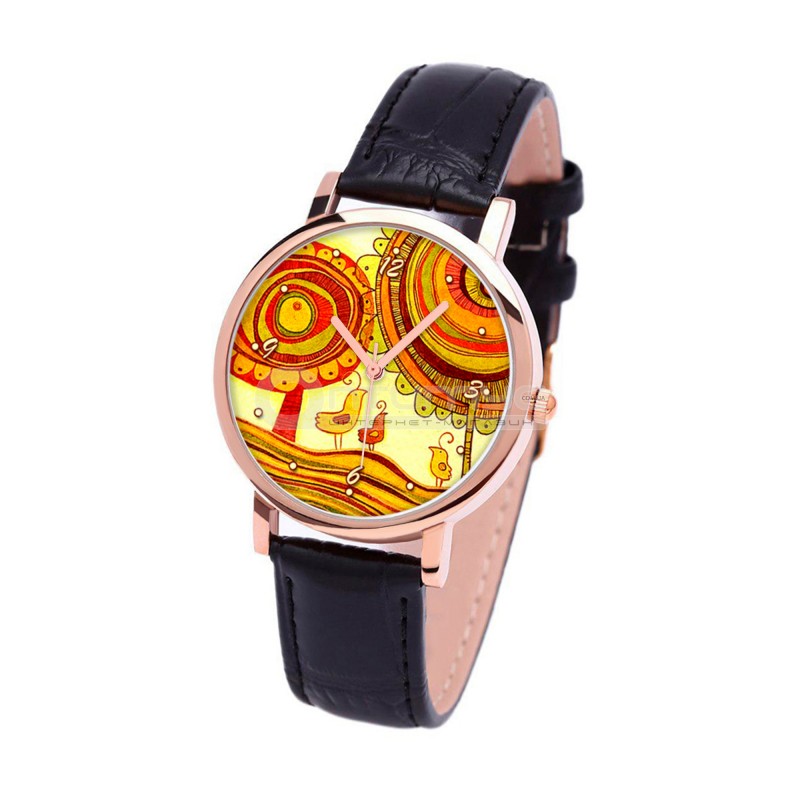 Наручные часы TIA Забавные птицы, черный ремешок, корпус розовое золото
