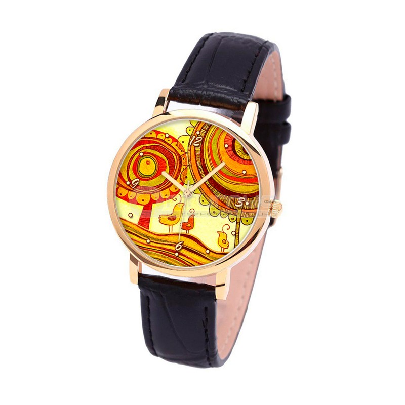 Наручные часы TIA Забавные птицы, чёрный ремешок, золотистый корпус