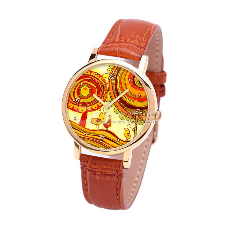 Наручные часы TIA Забавные птицы, рыжий ремешок, золотистый корпус