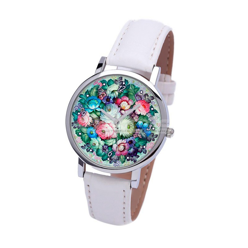 Наручные часы TIA Жостовская роспись, белый ремешок, серебристый корпус