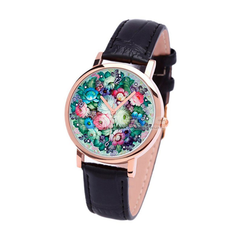 Наручные часы TIA Жостовская роспись, черный ремешок, корпус розовое золото