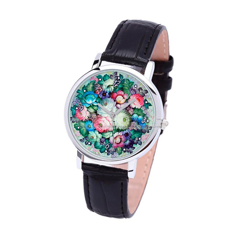 Наручные часы TIA Жостовская роспись, черный ремешок, серебристый корпус