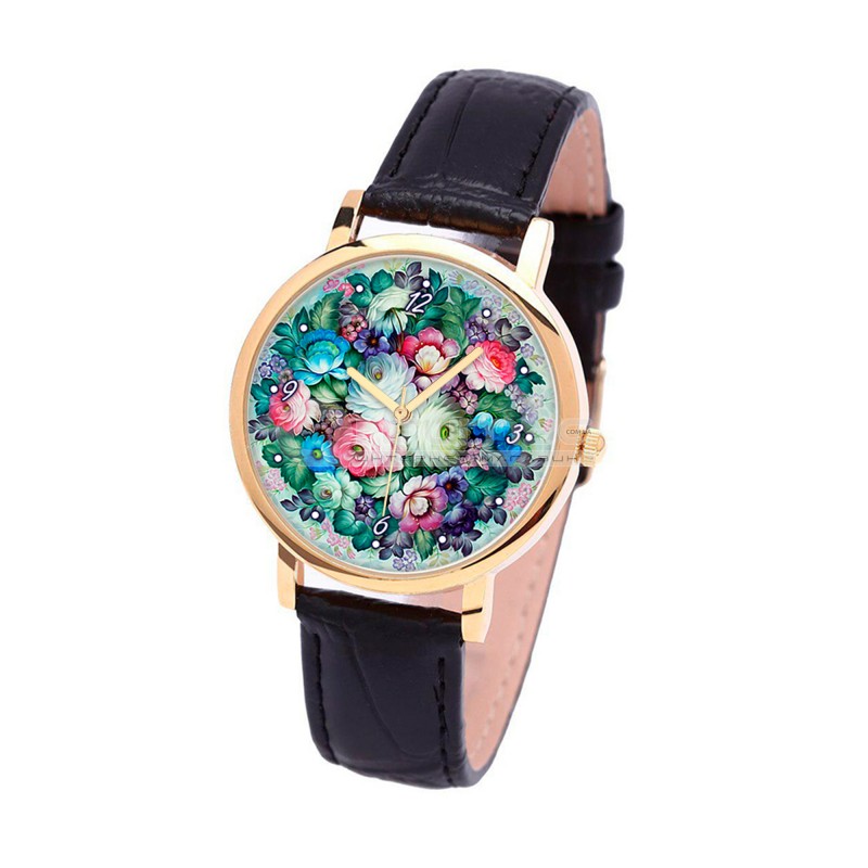 Наручные часы TIA Жостовская роспись, черный ремешок, золотистый корпус