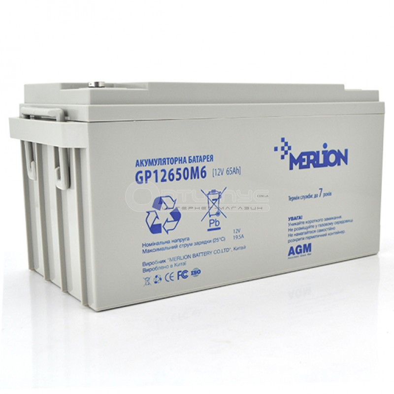 Кислотно-свинцевий AGM акумулятор Merlion GP12550M6 12 В 65 Ач має постійний струм 12 В, ємність 65 Ач і вагу 18 кг. Забезпечить якісну і тривалу роботу будь-якому вашому ехолоту.