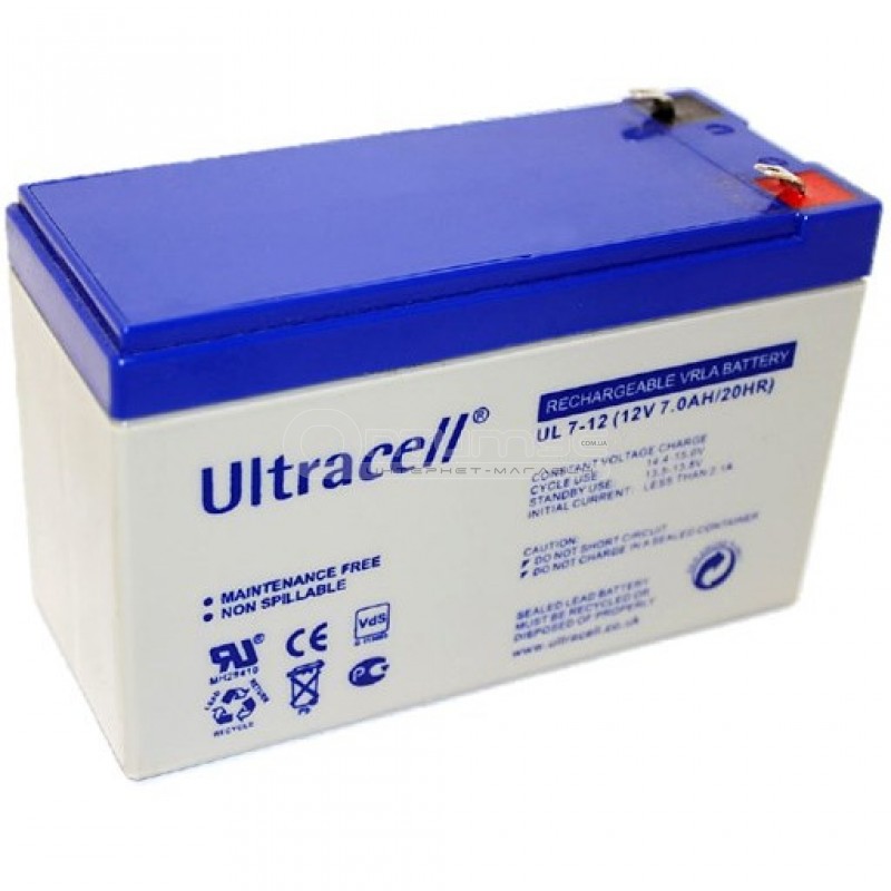 Акумуляторна батарея Ultracell UL7-12 AGM 12 В 7 Ач виготовлена за технологією AGM - це різновид акумуляторів, в яких рідкий електроліт доведено до желеподібного стану завдяки додаванню в нього сполук кремнію. У таких АКБ електроліт не витікає при трясці і незначних пошкодженнях корпусу. АКБ Ultracell UL7-12 із серії AGM (серія акумуляторів UL) чудово підійде для роботи на джерелах безперебійного живлення і системах із циклічним навантаженням.