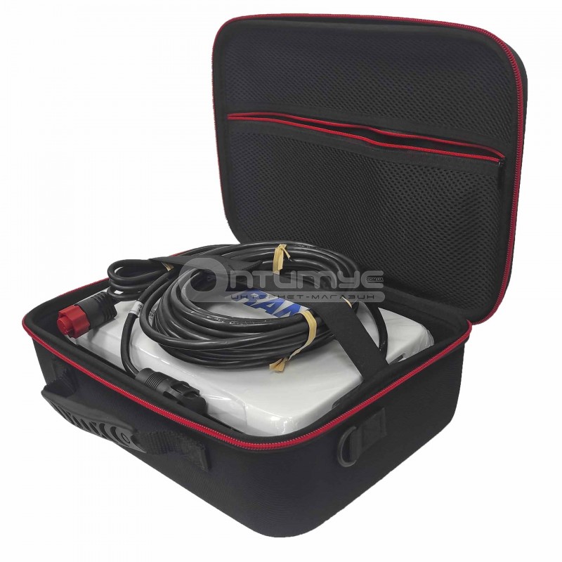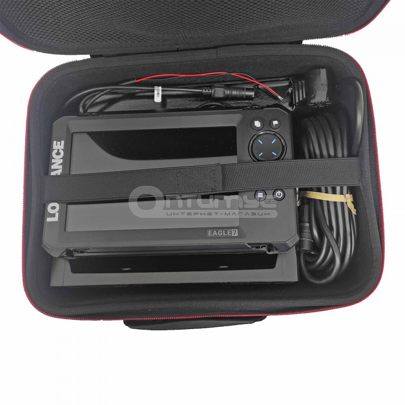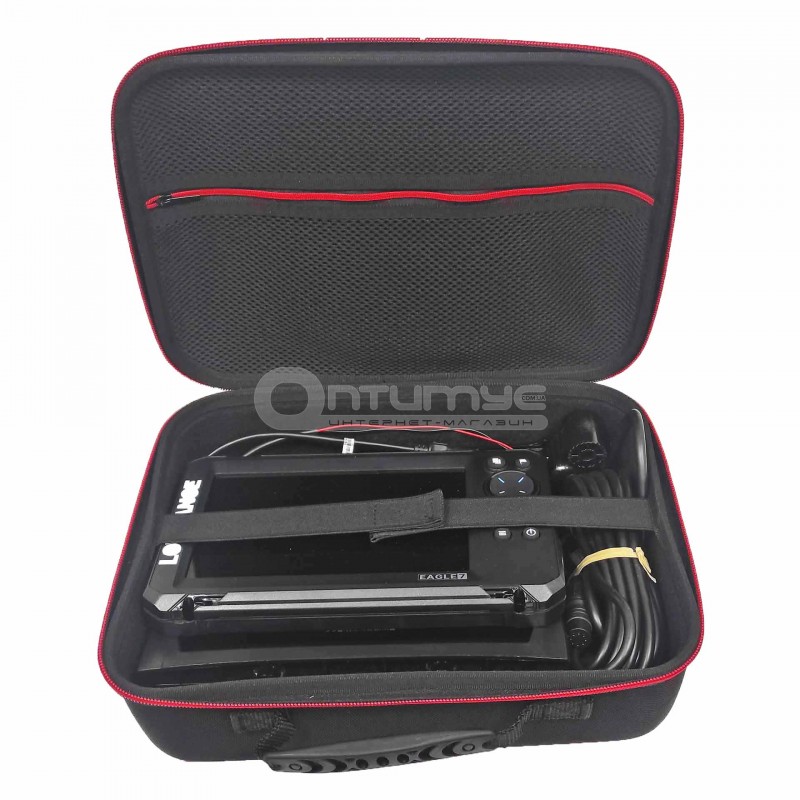 Сумка зроблена з пластику, який обтягнутий щільним нейлоном. Має захист від дощу і від бруду. Призначена для зберігання і перенесення різних ехолотів і підводних камер. Також ви можете зберігати в ній документи, смартфон або іншу електроніку, яку використовуєте в човні. Сумка має компактний розмір і зручну ручку для перенесення, так само в комплект входить ремінь через плече. Усередині сумки є кишенька з сітки для дрібних речей і поролонова вставка з перфорацією. Завдяки перфорації поролону ви можете легко вирізати заглиблення під свої потреби. Зручні розміри дають змогу вмістити в неї різні ехолоти з великими датчиками. Для прикладу, в цю сумку легко поміщаються ехолоти Lowrance з діагоналлю екрана 7-9 дюймів з дачиками Active Imaging 3 in 1 або Tripleshot. Екрани ехолотів лягають з датчиками, кабелем живлення і підставкою під екран. Все буде в одному місці та під надійним захистом від бруду, вологи та падіння.