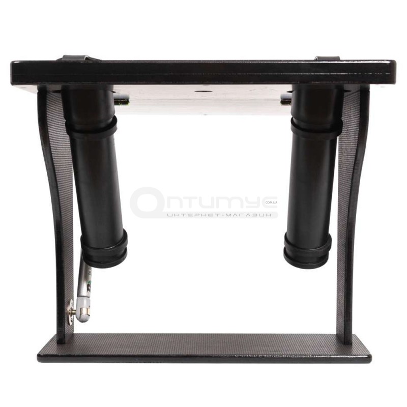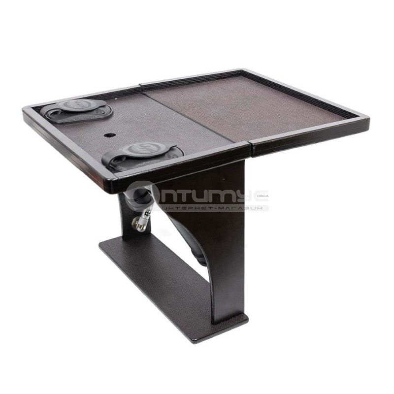 Розкладний столик в човен для вудилищ і ехолота призначений для установки в надувний човен. Даний аксесуар може використовуватися для установки ехолота, акумулятора, двох вудилищ в підстаканники. За рахунок розкладного механізму на газовому амортизаторі столик може увелічеть в розмірах в 2 рази, що дозволить вам розташувати на ньому не тільки ехолот, а й багато інших предметів - снасті, їжа, напої. Великою перевагою даного девайса є наявність ботріка по периметру столика. Завдяки такій конструкції у вас нічого не покотитись за межі столу навіть при хвилі.