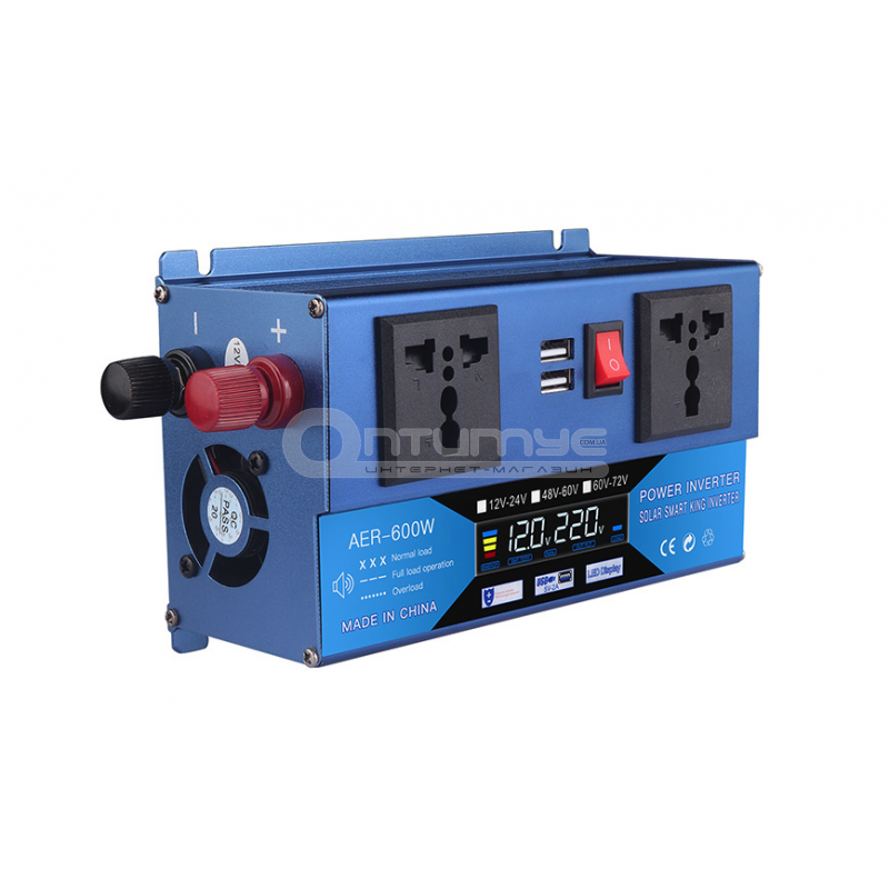 Інвертор напруги Voltronic AER-600W забезпечує модифіковану синусоїду з номінальною потужністю 600 Вт. Пристрій працює з вхідною напругою 12-24 В і вихідною напругою 220 В, перетворюючи постійний струм у змінний. Особливостями інвертора є наявність двох роз'ємів USB та двох розеток. Підключення здійснюється до акумулятора автомобіля. Інвертор захищений від перевантажень, перегріву та розряду акумуляторної батареї. Коефіцієнт корисної дії перевищує 90%. Вага пристрою становить 0.8 кг. Виробник – Китай, гарантійний термін – 2 місяці. Комплектація включає інвертор та комплект проводів для підключення.