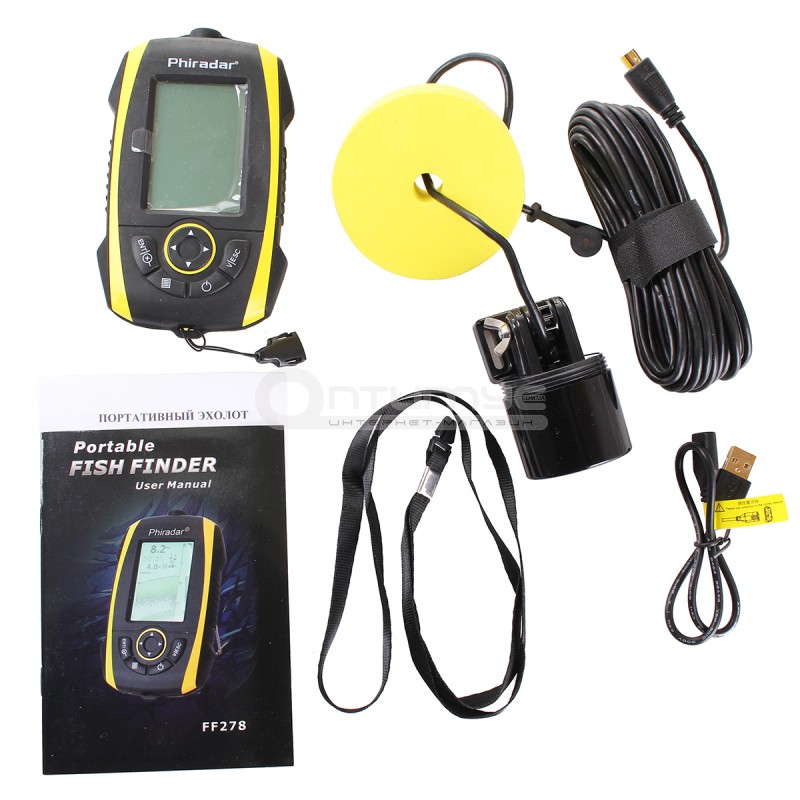 Монітор ехолота, USB кабель для зарядки, шнурок на шию, датчик з кабелем 7,5 м, інструкція |