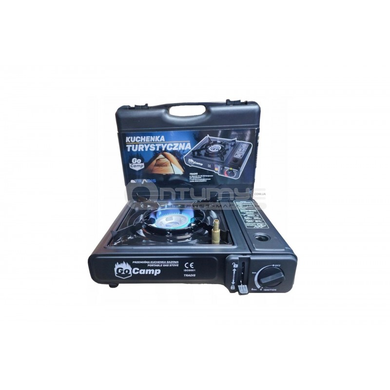 Туристична газова плитка Go Camp під цанговый балон з перехідником під зовнішній балон - компактна газова плита для туристичних поїздок на природу та місця, де відсутні блага цивілізації. Стійка та міцна, завдяки чому можна приготувати їжу у досить великій каструлі. Запакована в пластиковий кейс для зручного перенесення та зберігання плити.