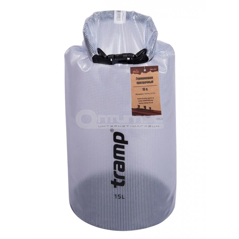 Гермомішок Tramp прозорий 15 л - це надійний і зручний аксесуар для любителів активного відпочинку і подорожей. Він виготовлений з міцного терпауліну з ПВХ-покриттям, що забезпечує високий ступінь захисту від вологи, пилу і бруду. Завдяки прозорому матеріалу, ви завжди зможете легко побачити, що знаходиться всередині, без необхідності відкривати мішок.