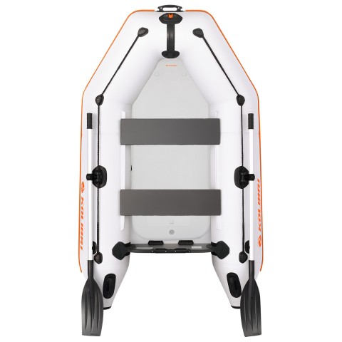 Звертаємо вашу увагу на те, що дана модель надувного човна не комплектується Днищевой настилом - виробник дає вільний вибір своїм покупцям доукомплектувати тим типом настилу, який підходить саме вам. І тут є 3 варіанти різних дніщевих настилів. Найпростіший і недорогий варіант - слань-килимок, настил складається з трьох окремих сланей поміщених в бічні чохли - на ньому зручно стояти і пересуватися на моторі невеликої потужності. Однак же, якщо Ви хочете, що б днищевой настил закривав все днище і снасті не губилися по СЛАН, то другий варіант настилу - слань-книжка, ідеальний вибір для вас, так само цей настил допоможе уникнути вібрації днища при руху на потужному моторі. Складається слань-книжка з декількох листів водовідштовхувальним фанери, які склеєні між собою ПВХ стрічкою і укомплектовується в окрему сумку. Третій тип настилу, надувний підлогу Air-Deck - це, мабуть, найлегший і вишуканий тип днища в човен. Він дуже компактно складається, легко встановлюється і збирається, має досить жорстку конструкцію і в накачаному стані навіть не прогинається під вагою в 70 кг.