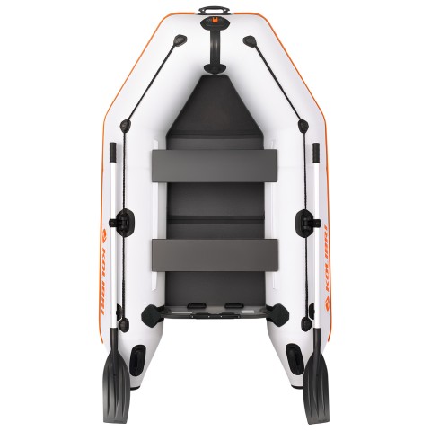 Звертаємо вашу увагу на те, що дана модель надувного човна не комплектується Днищевой настилом - виробник дає вільний вибір своїм покупцям доукомплектувати тим типом настилу, який підходить саме вам. І тут є 3 варіанти різних дніщевих настилів. Найпростіший і недорогий варіант - слань-килимок, настил складається з трьох окремих сланей поміщених в бічні чохли - на ньому зручно стояти і пересуватися на моторі невеликої потужності. Однак же, якщо Ви хочете, що б днищевой настил закривав все днище і снасті не губилися по СЛАН, то другий варіант настилу - слань-книжка, ідеальний вибір для вас, так само цей настил допоможе уникнути вібрації днища при руху на потужному моторі. Складається слань-книжка з декількох листів водовідштовхувальним фанери, які склеєні між собою ПВХ стрічкою і укомплектовується в окрему сумку. Третій тип настилу, надувний підлогу Air-Deck - це, мабуть, найлегший і вишуканий тип днища в човен. Він дуже компактно складається, легко встановлюється і збирається, має досить жорстку конструкцію і в накачаному стані навіть не прогинається під вагою в 70 кг.