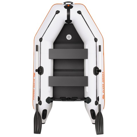Човен Kolibri км- 245D світло-сіра + слань-книжка відноситься до стандартного вигляду та має стаціонарний транец, який дозволяє укомплектувати ваше судно бензиновим мотором потужністю до 5 л. с. або електромотором. Але також човен додатково укомплектована алюмінієвими розбірними веслами.