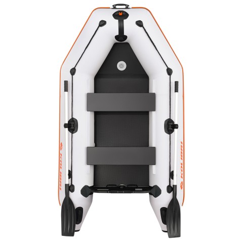 Човен Kolibri км- 260D світло-сіра + слань-книжка відноситься до стандартного вигляду та має стаціонарний транец, який дозволяє укомплектувати ваше судно бензиновим мотором потужністю до 5 л. с. або електромотором. Але також човен додатково укомплектована алюмінієвими розбірними веслами.