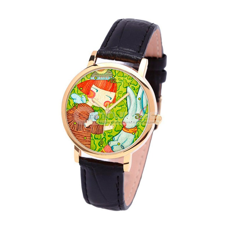 Наручний годинник TIA Дівчина з кроликом чорний ремінець, золотистий корпус