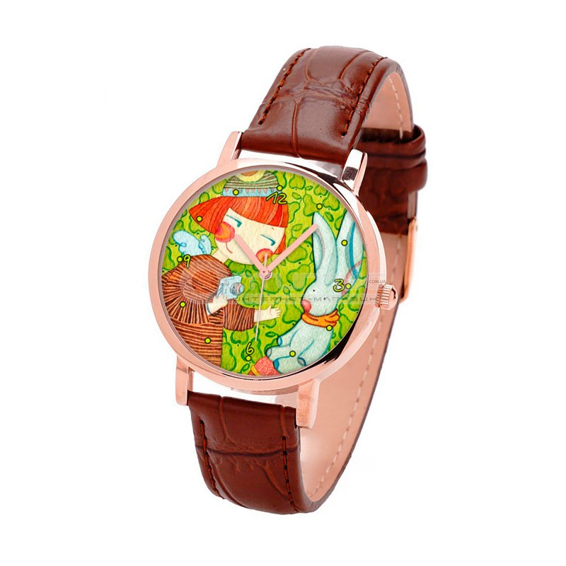 Наручний годинник TIA Дівчина з кроликом коричневий ремінець, корпус рожеве золото