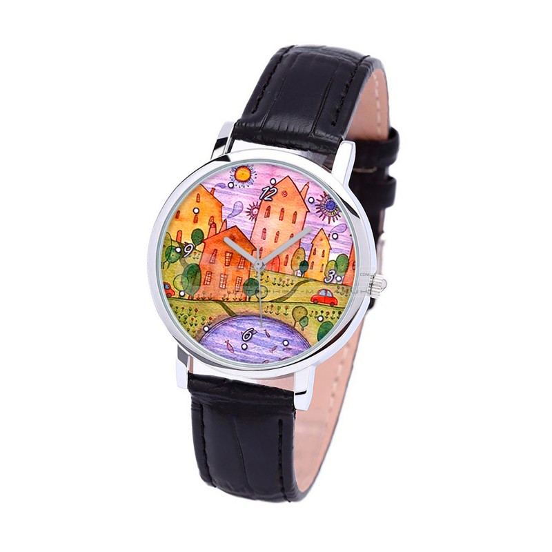 Наручний годинник TIA Гарний маленький місто, чорний ремінець, сріблястий корпус