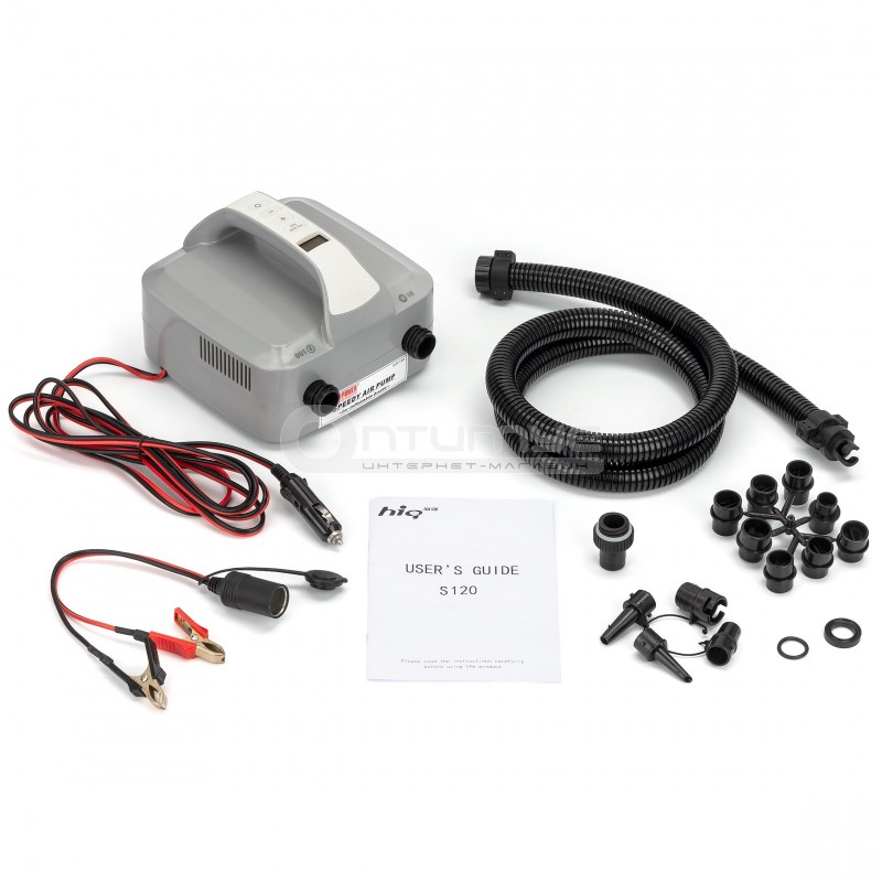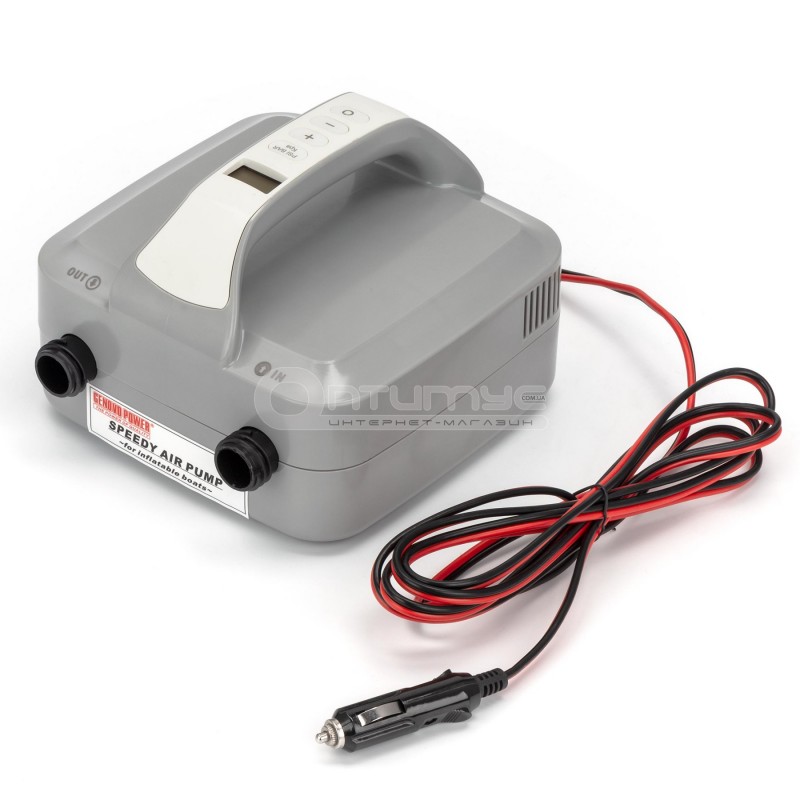 Для SUP, човнів, Air-Deck, Кількість ступенів накачування: 2 (1-й - центрифуга, 2-й - поршневий), вага, кг: 1,8, Манометр: вбудований, Тип живлення: Від зовнішнього джерела (гніздо прикурювача), Комплектація : Насос з кабелем живлення, шланг з перехідниками |