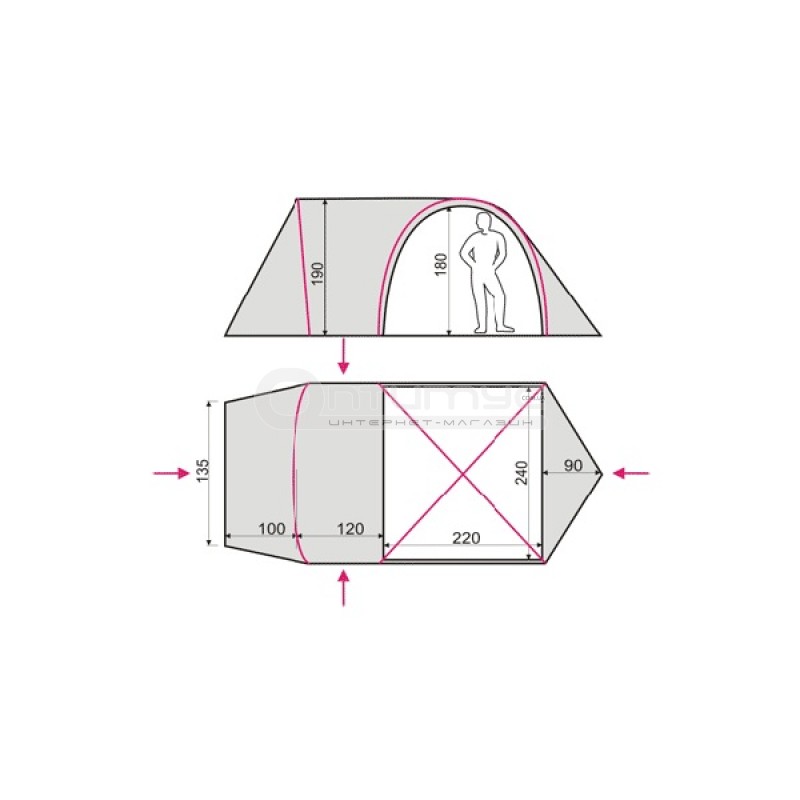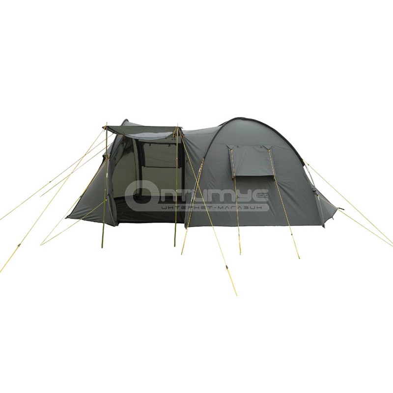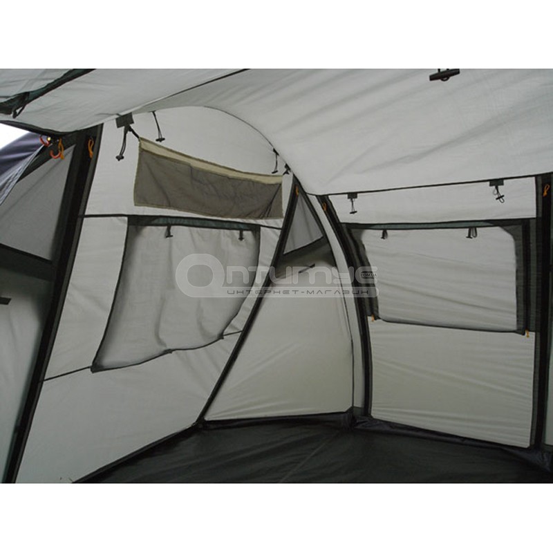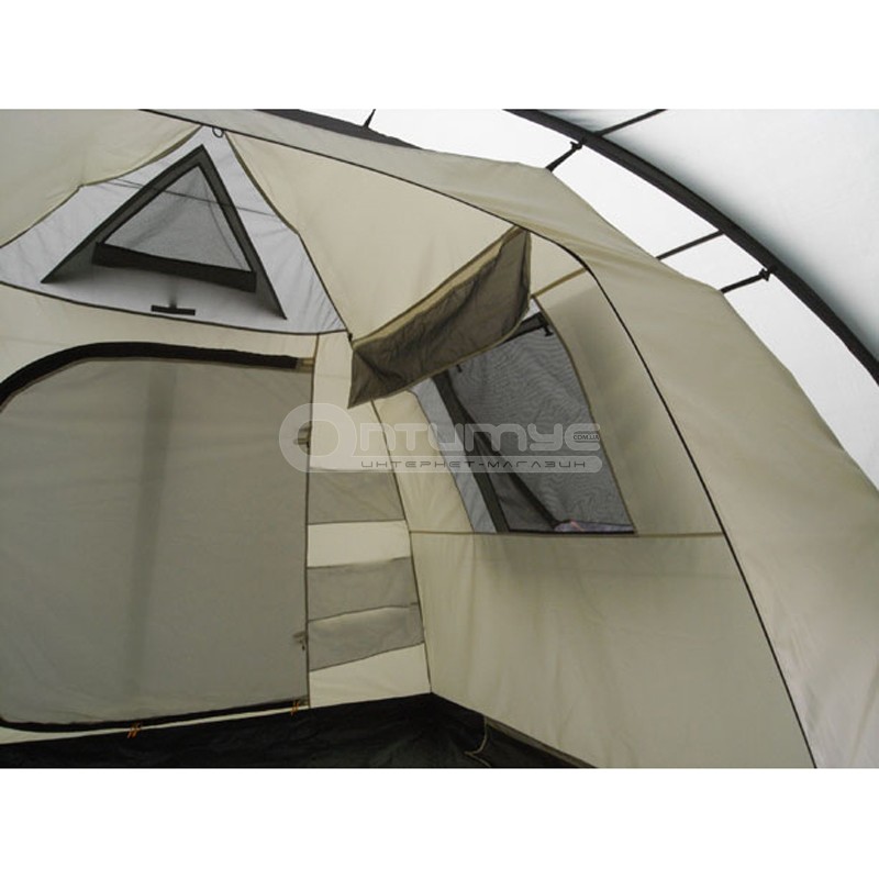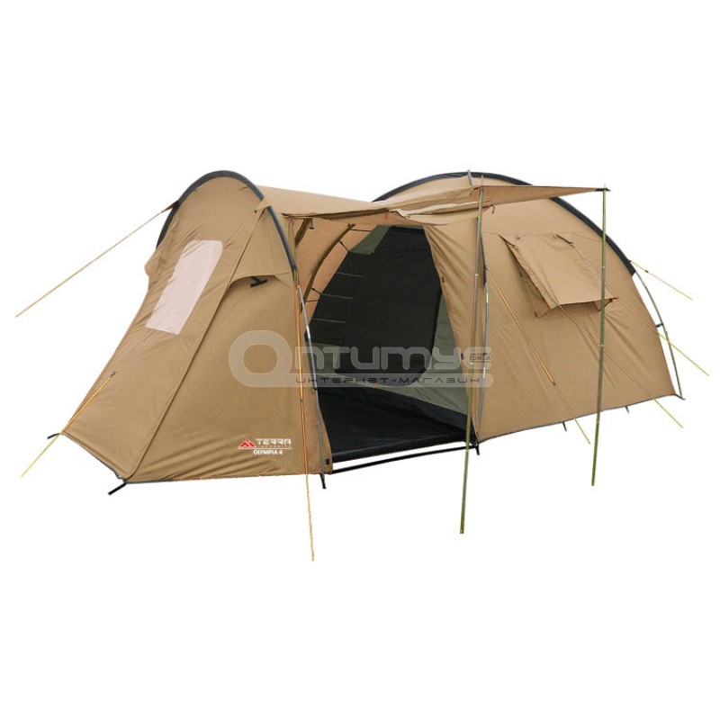 У наметі Terra Incognita Olympia 4 пісочна просторий передній тамбур, має три входи, і в ньому можна вмістити стіл, стільці і кемпінгову кухню. Додатковий задній вхід в спальне приміщення забезпечує ефективну вентиляцію. Для більшого затишку і комфорту можна пристебнути додаткову підлогу в тамбур (входить в комплект). Конструкція дозволяє використовувати тент без спального приміщення як їдальню, склад або базову палатку.
