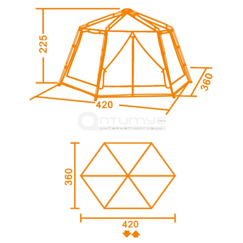 Шатер Кемпінг Sunroom - високий і просторий тент для дружної великої родини або компанії друзів. Відмінний вибір для любителів відпочинку на природі! Чи захистить від сонця, дощу і вітру. Всі вікна оснащені москітні сітки, що позбавить від докучливих комах. Всередині достатньо місця для розкладного столу і стільців.