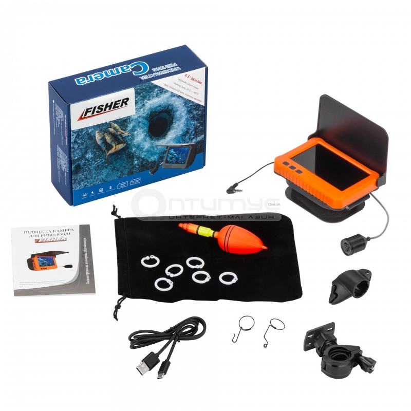 Монітор із вбудованим акумулятором і кабелем 15 м, USB кабель для зарядки, кріпильні елементи, стабілізатор камери в горизонтальному положенні, поплавок, чохол, інструкція |