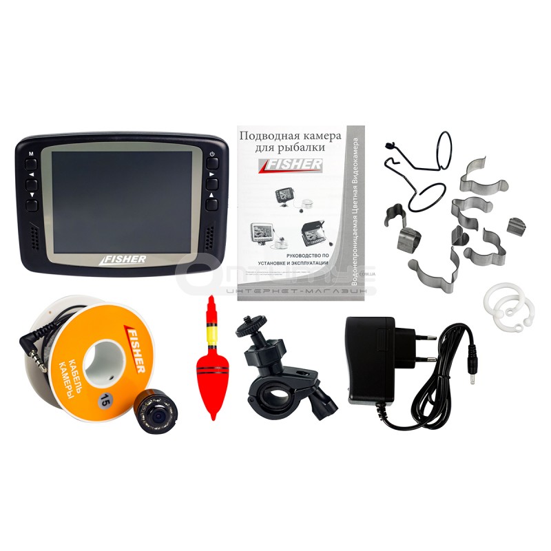 Відеокамера з кабелем на котушці 15 м, монітор з вбудованим акумулятором, зарядний пристрій від 220В, кріпильні елементи, поплавок, інструкція російською мовою |