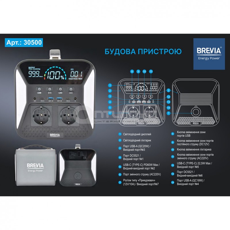 Зарядна станція Brevia 500W NCA пропонує ефективне та надійне заряджання. Вона використовує нікель-кобальт-алюмінієві (NCA) акумулятори з місткістю 134400 мА*год. Загальна вихідна потужність станції складає 500 Вт, а максимальна потужність пристроїв (X-Boost) - 1000 Вт. Можливе заряджання від сонячної панелі, автомобіля або мережі змінного струму, використовуючи блок зарядки постійного струму. Станція оснащена різноманітними виходами, такими як Type-C, USB, автоприкурювач та розетка 220 В. Забезпечується захист від короткого замикання, перенавантаження та перегрівання. Додаткові особливості включають ліхтарик, світлодіодний екран та функцію ДБЖ. Час зарядки акумулятора становить до 4 годин. Гарантія на товар - 12 місяців. Комплектація включає портативну зарядну станцію, кабель для підзарядки від мережі 220 В, кабель для підзарядки від автомобіля та інструкцію з використання.
